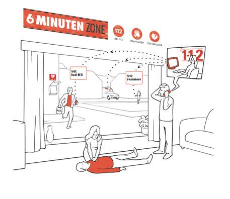 Aangezien de gemiddelde aanrijtijd van de ambulances in de regio Noord-Holland veel langer is dan 6 minuten, is het van levensbelang dat omstanders de bovengenoemde handelingen uitvoeren, in afwachting van de ambulancezorgverleners. Daarom heeft de Hartstichting het begrip 6-minutenzone geïntroduceerd. Een 6-minutenzone is een gebied waar elk slachtoffer van een hartstilstand binnen 6 minuten reanimatie krijgt en de eerste schok toegediend wordt, door met name de burgerhulpverleners of het ambulancepersoneel (zie figuur 6-minutenzone hieronder). Als een integraal onderdeel van de 6-minutenzone worden de ‘lekenhulpverleners’ door de Hartstichting getraind in het uitvoeren van een reanimatie en het omgaan met een AED.