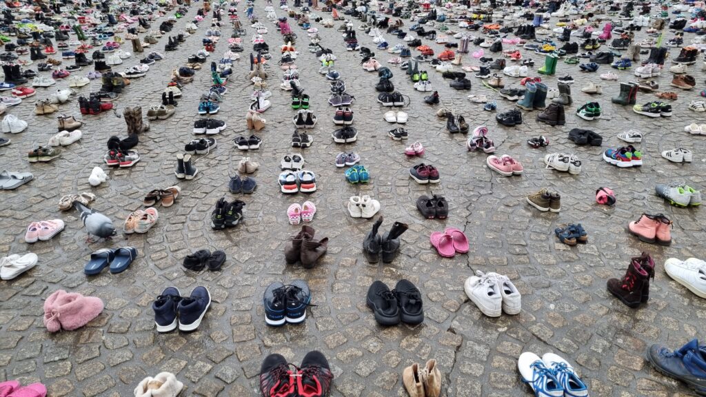 Tijdens de herdenkingsprotesten worden de namen en leeftijden van de vermoorde kinderen opgelezen. Indrukwekkend en kippenvel. Of zoals Kelli van der Waals treffend beschreef in een column in Trouw: …..”een plein vol schoentjes. Duizenden paren kinderschoentjes, opgesteld in lange rijen, het hele enorme plein over. Roze gympjes, rode gympjes, gele slippertjes, zwarte laarsjes. Op sommige lag een bloem, of een knuffelbeest. Een hoeveelheid die, als je het zo zag staan en tot je door liet dringen, even stevig de lucht uit je longen drukte.”