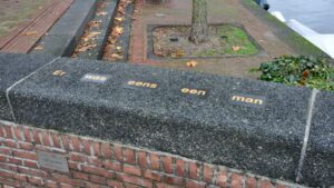 “Er was eens een man / zijn hart beklemd door twee handen van droefheid / Hij keek uit over het dok volgestouwd met schepen / zoals zijn hart een haven vol treurnis was”. Dit fragment uit een gedicht van schrijfster, journalist, docent en buurtgenoot Carla Bogaards is sinds 2006 op de halfronde kademuur aan de Hollandse Tuin te bewonderen. Het hele gedicht heet Walk on water.
